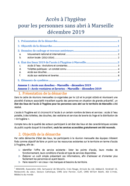 Ce diagnostic est une réactualisation de démarches réalisées en 2012 puis 2014. Il recense l’accès à l’eau (fontaines potables), aux douches, toilettes publics, laveries gratuites et vestiaires.