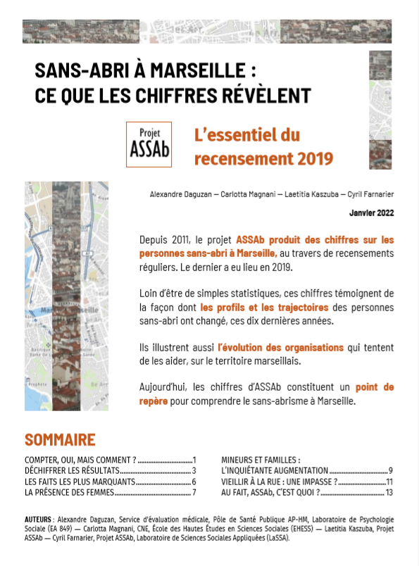 Ces documents présentent les principaux résultats du recensement d’ASSAb mené sur les files actives 2022 des lieux d’accueil bas seuil de Marseille. Plus largement, ils mettent en perspective une décennie de recensement du sans abrisme marseillais et questionnent l’usage qui peut être fait de ces données et de leurs interprétations.
